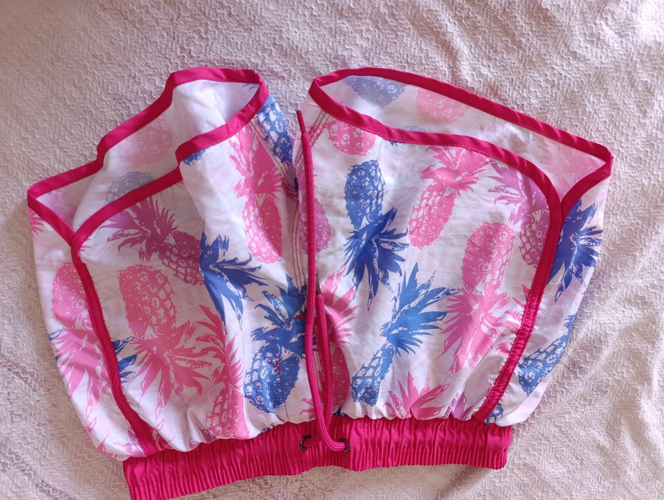 Renkli ananas desenli, kısa boylu bohem plaj kıyafeti. Askılı, bol kesim ve önden fermuarlı tasarıma sahiptir.