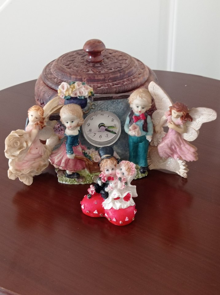 Renkli antik pembe biblo seti, küçük bir saat ve gelin-damat ile peri figürleri iceririr..