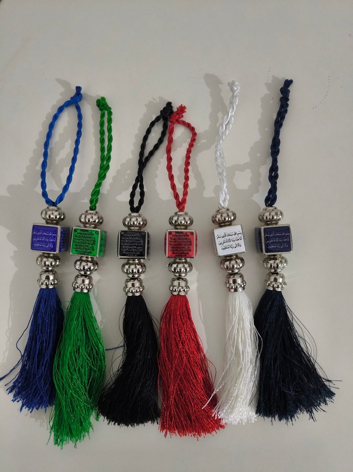 Renkli araba ayna süsü, çeşitli canlı renklerde püsküllerle, geleneksel bohem tarzında tasarlanmıştır. Her set örgülü halka ve gümüş tonlu detaylara sahiptir.