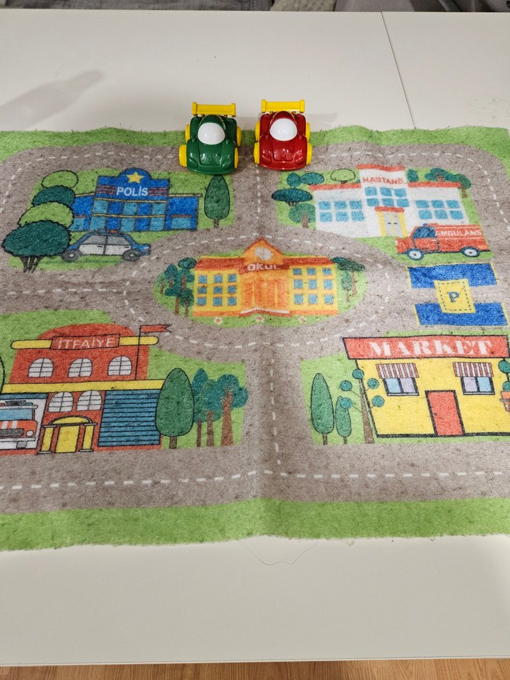 Bu renkli çocuk halısı, polis merkezi, hastane, okul, itfaiye ve market gibi eğlenceli bir kasaba tasarımına sahiptir. Çocuk oyun alanları için yumuşak dokuludur. Yıkanabilir