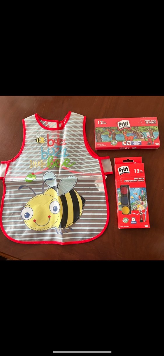 Gri çizgili, kırmızı kenarlı, arı desenli renkli çocuk önlüğü ve Pritt markalı 12 renk sulu boya ve pastel boya seti.