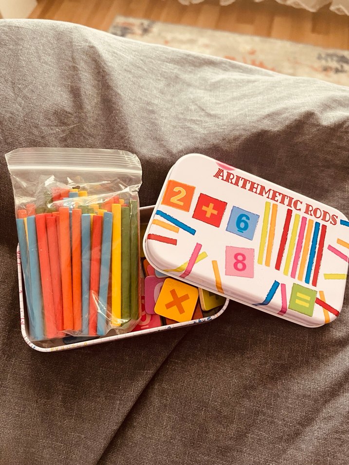 2 yaş ve üzeri çocuklar için renkli aritmetik çubuklar, kompakt teneke kutuda saklanır.