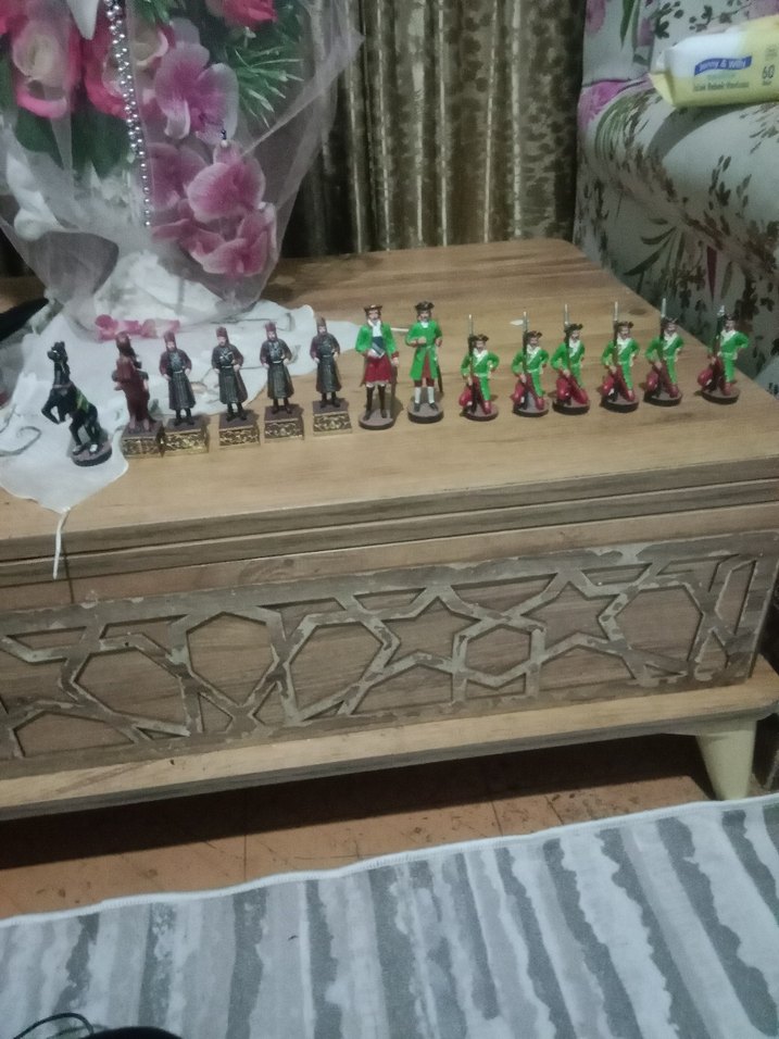 Renkli asker figürlerinden oluşan satranç takımı, koyu ve canlı renklerle detaylı tasarıma sahip.