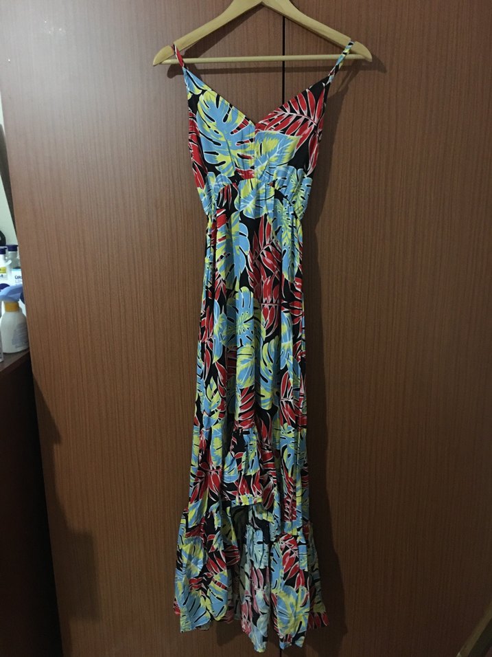 Renkli tropikal yaprak desenli, askılı, bol kesim ve drapeli uzun bohem elbise.