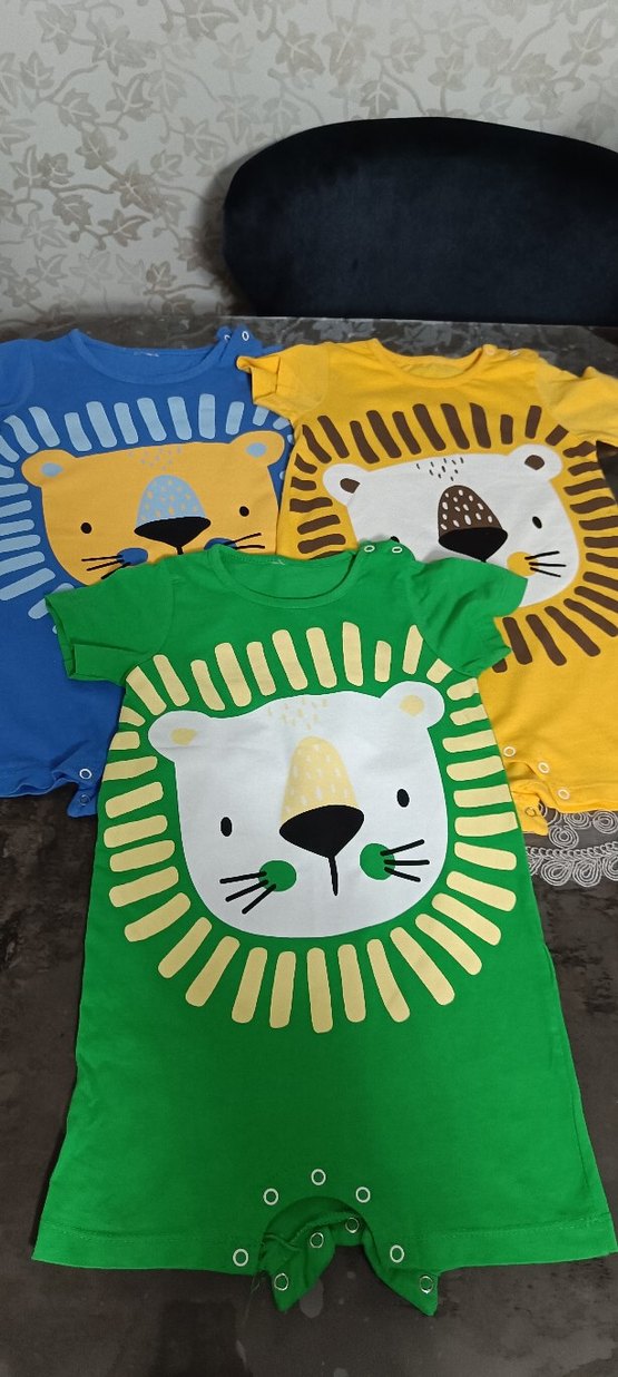 Yumuşak ve sıcak kumaştan yapılmış, renkli aslan baskılı çocuk tulumları. Mavi, sarı ve yeşil renk seçenekleri ve omuzlarda çıtçıt düğmeler bulunur. Ağ kısmı düğmeli,şort tulumdur.Üçü bir arada bu fiyata kaçmaz. Çok az giyildi deformasyon yoktur.#yazlıkbebek tulumu #şortlutulum