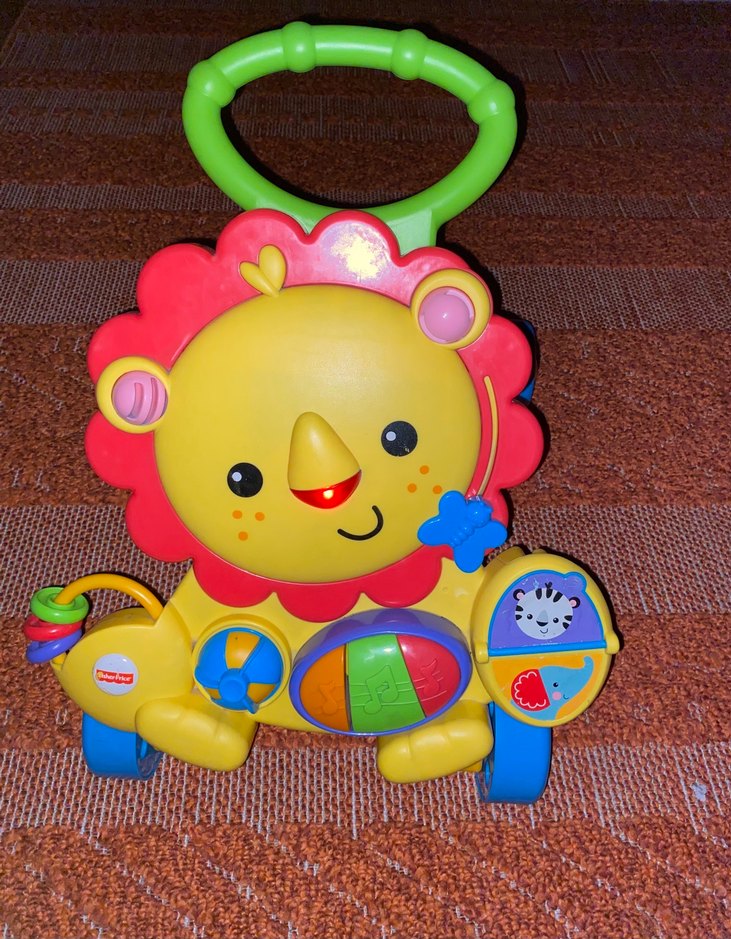 Aslan şeklinde, ışıklı burun ve etkileşimli düğmeleri olan renkli bebek yürüteci. Işıklı ve müzikli çalışıyor ürün göründüğü gibidir