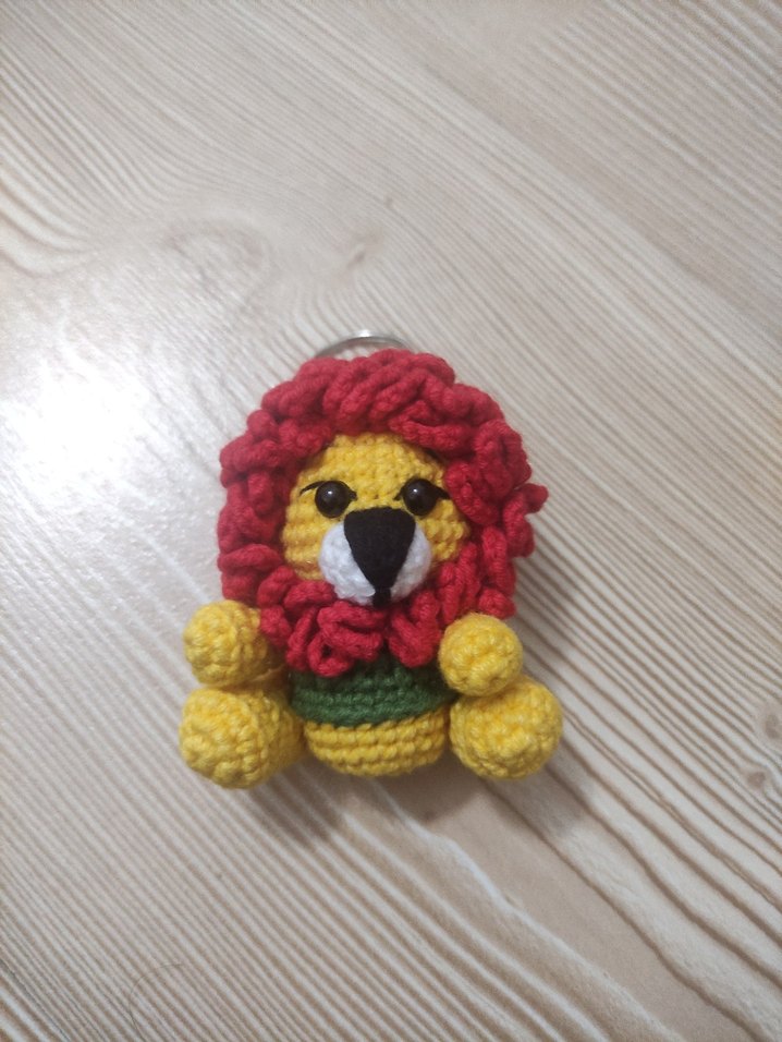 Yumuşak iplikten yapılmış, detaylı yelesi ve yüz özelliklerine sahip renkli el örgüsü aslan anahtarlık. Küçük peluş aksesuar.
