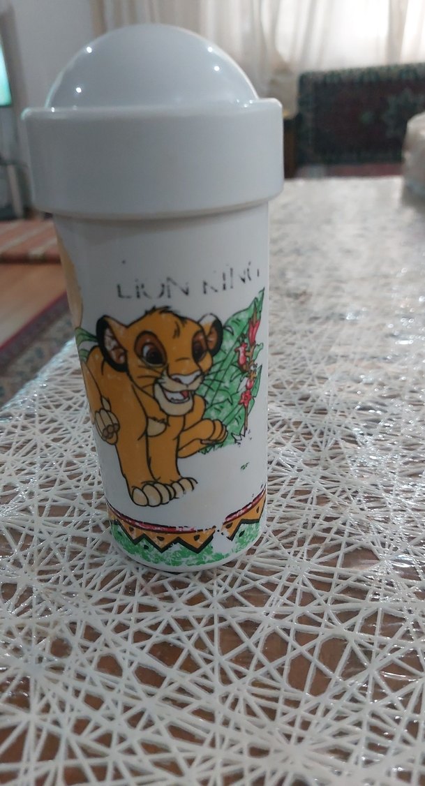 Beyaz gövdesi ve renkli Aslan Kral figürü olan çocuk termosu, içecekleri sıcak tutar ve kolay taşınır.
