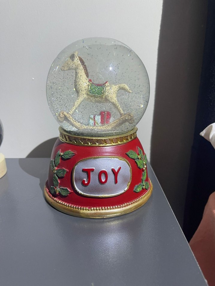 İçinde sallanan at figürü bulunan, "JOY" yazılı kırmızı tabanlı renkli kar küresi.