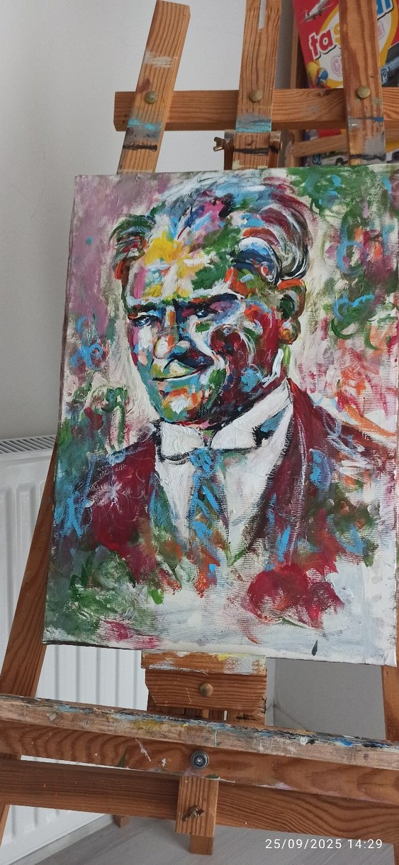 Bu tablo, Atatürk'ün koyu renkli, çok renkli portresini canlı ve ifade dolu fırça darbeleriyle sunar. 35-50