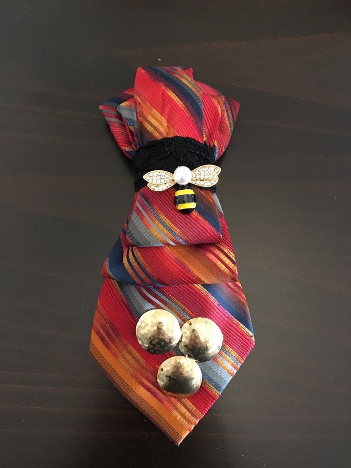 Renklivintage çizgili desenli erkek kravat, metalik ve arı şeklinde süslemelerle avant-garde tarzı yansıtıyor. Değişik renk,modellerle ,broşlarla süslenmiş ilginç kravat tasarımları-tek tek fiyat sorunuz. fiyat sorunuz-500 -900 fiyat aralığındadır