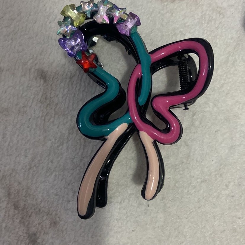 Renkli plastikten yapılmış, tokalı ve yıldız detaylı avant-garde tasarımlı kadın saç tokası.