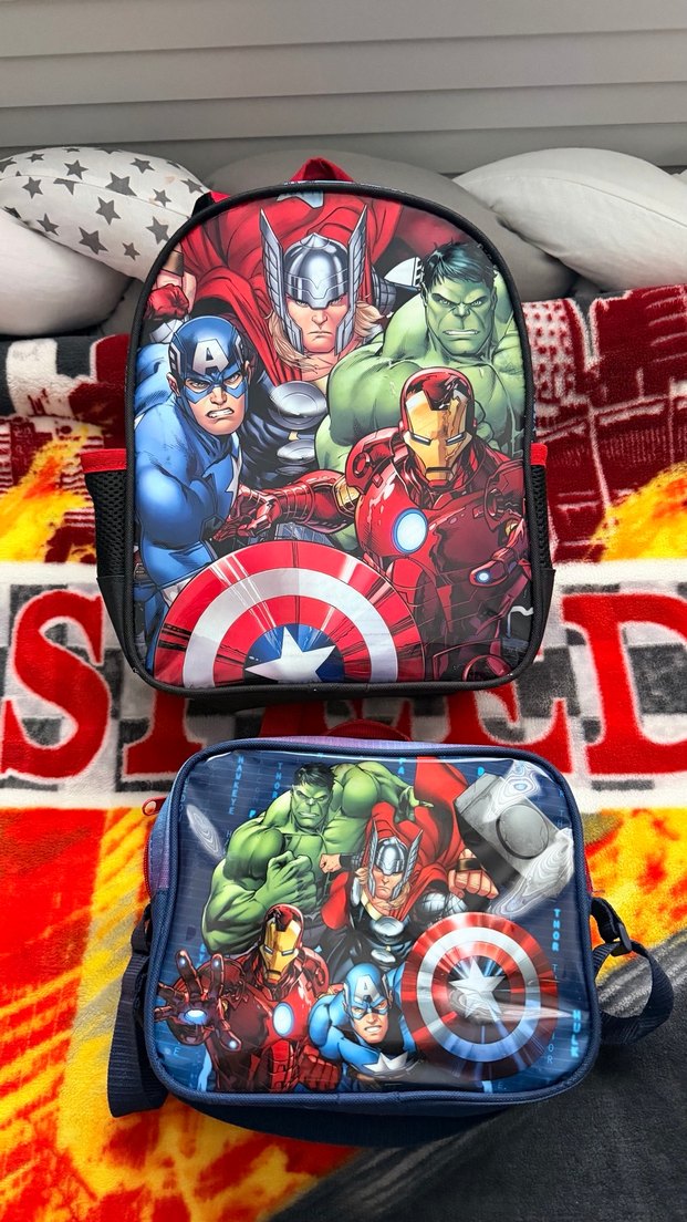 Renkli Avengers karakterlerinin yer aldığı çocuk okul çantası, Captain America, Thor, Hulk ve Iron Man figürlü.
