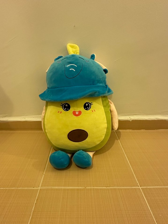 Bu renkli peluş oyuncak, mavi şapka takan sarı avokado karakterine sahiptir, yumuşak ve sevimlidir. Hiçbir yerinde yırtık dikiş atması yoktur