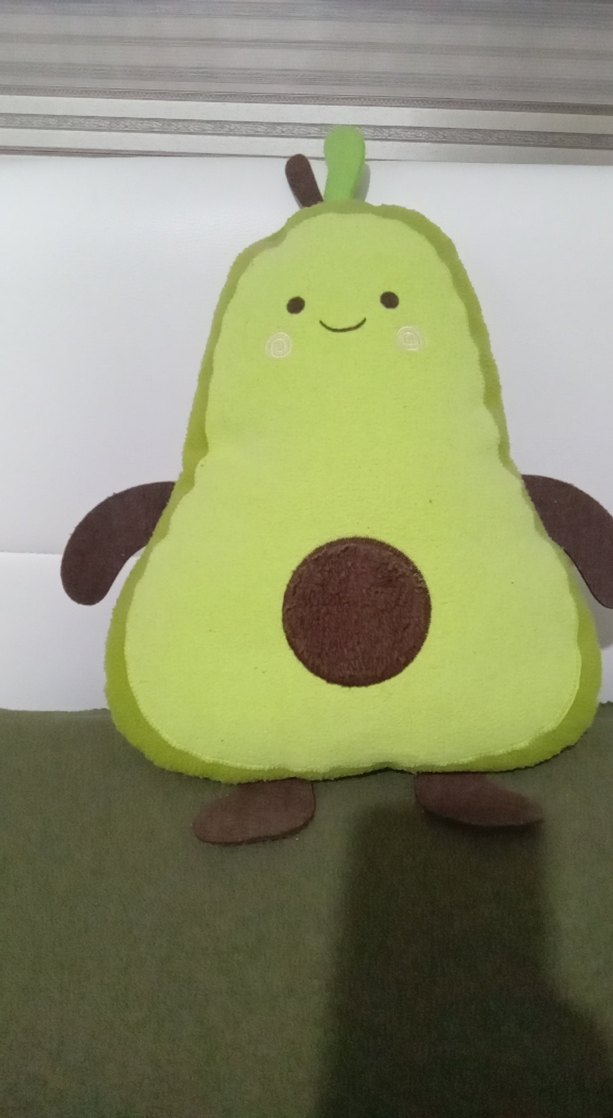 Renkli, avokado şeklinde peluş oyuncak, yumuşak dokulu kahverengi kollar, ayaklar ve çekirdek detayları ile. Gülümseyen yüz ifadesi bulunur. 45 cm