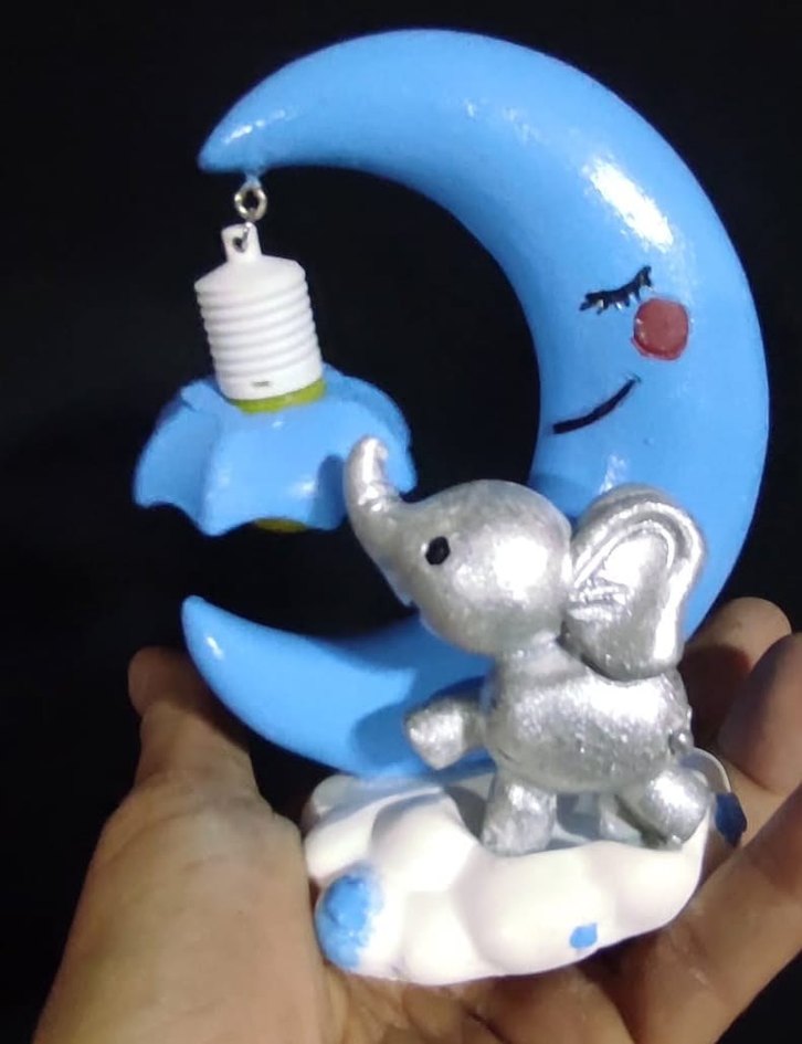 Renkli figürin, mavi hilal şeklinde gülen ay ve bulut üzerinde duran gümüş renkli fil ile küçük bir askılı fener içerir.