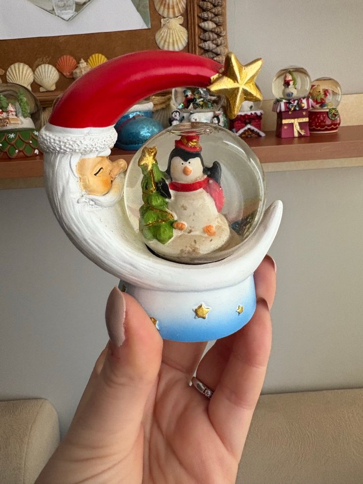 Kırmızı şapkalı hilal ay figürünün içinde penguen ve yılbaşı ağacı bulunan renkli kar küresi figürü. Altında altın yıldız süslemeleri var. ❄️ Hiç bir kusuru yok