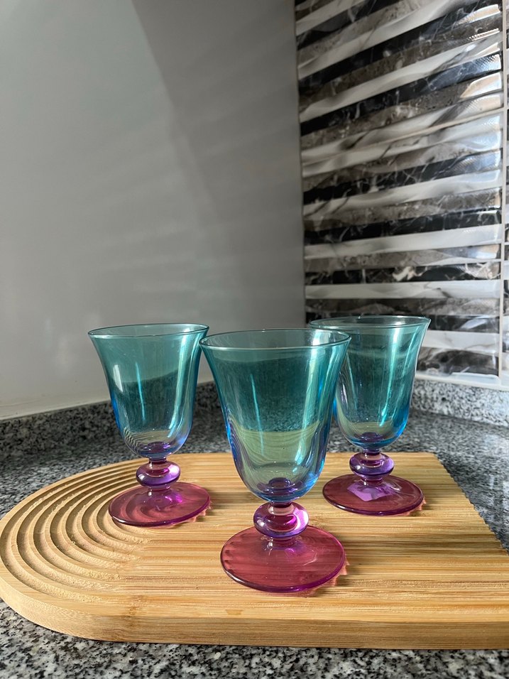Mavi kadeh ve pembe ayaklı, renkli ve şık cam kadehler seti. İçecek servisinde kullanıma uygundur.