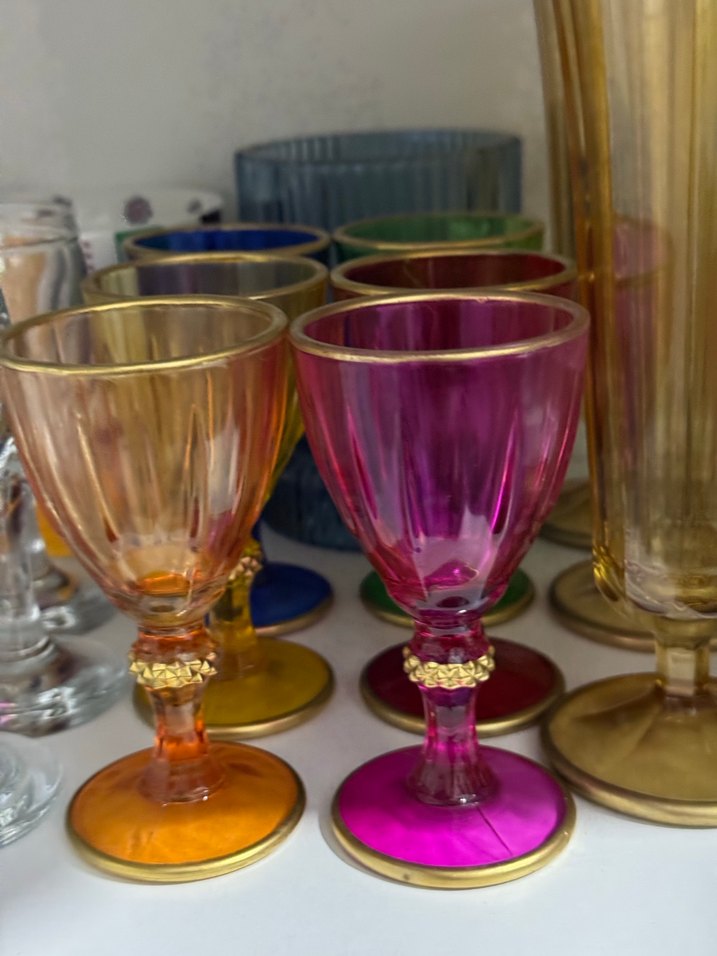 Altın detaylı, canlı renklerde ayaklı cam bardaklar, şık ve renkli tasarımıyla içecek sunumuna uygundur.