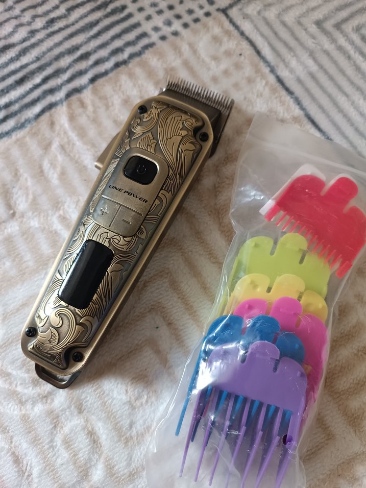 Detaylı desenli metal gövdeye sahip elektrikli saç kesme makinesi, farklı saç uzunlukları için renkli tarak seti ile birlikte gelir. ✂️