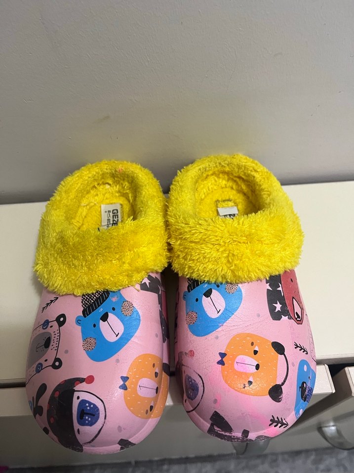 Çocuk 29 numara renkli ayı desenli baskıya ve yumuşak, sarı kürk detaylı iç astara sahiptir. Rahat platform, günlük kullanıma uygundur. Ev terliği.