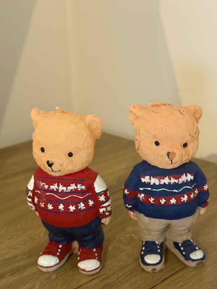 Desenli kazak ve spor ayakkabı giymiş iki renkli ayı figürü, bir yüzeyde duruyor. Sıfır mum