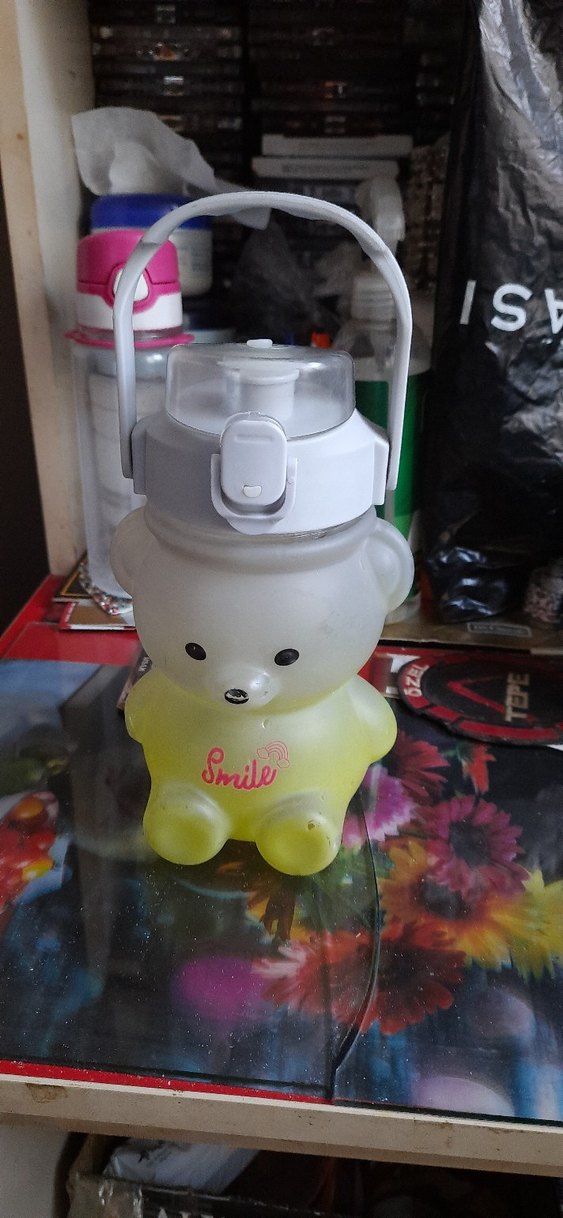 Renkli, ayı şeklinde çocuk termos şişesi. Kilitli kapak ve saplı, 'Smile' yazılıdır. İçecekleri sıcak veya soğuk tutar.
