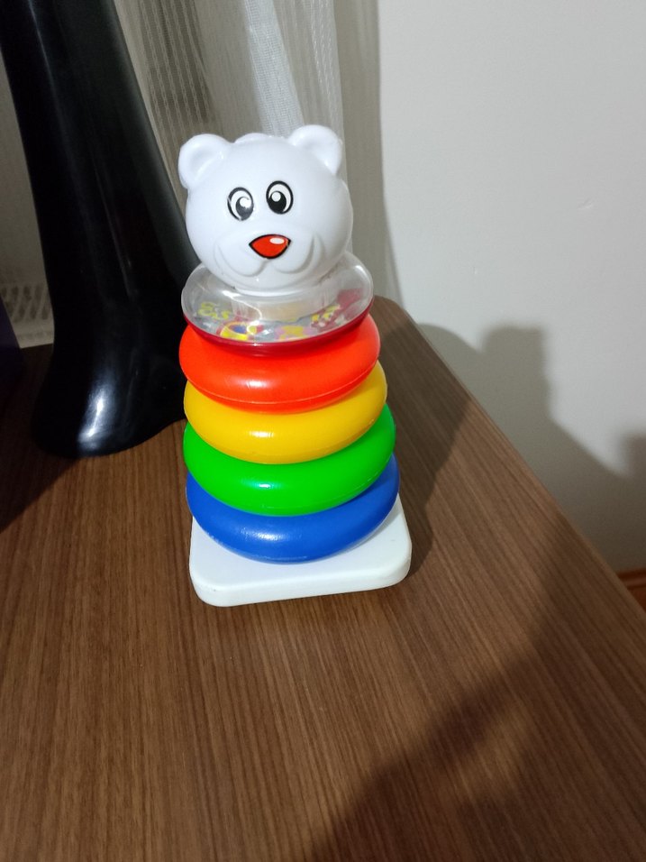 Renkli halkaları ve ayı figürü olan bu eğitici oyuncak, motor becerileri geliştirmek için uygundur.