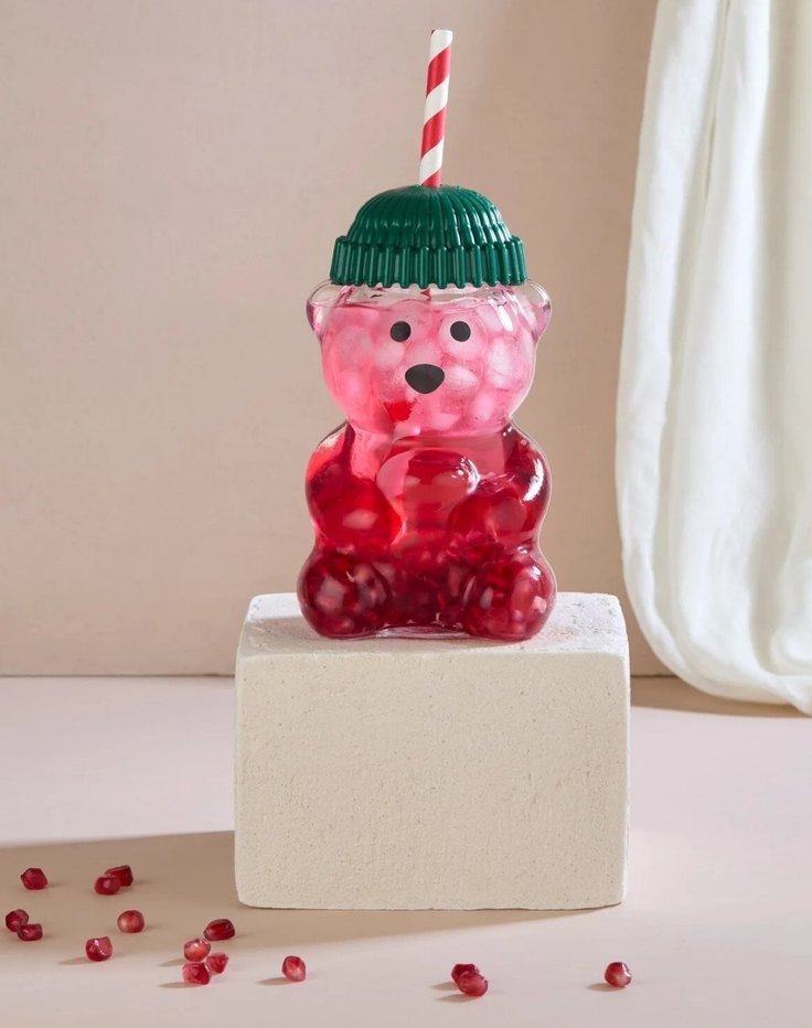 Renkli, pembe ayı figürlü bardak yeşil kapak ve çizgili pipetle birlikte sunulmaktadır.