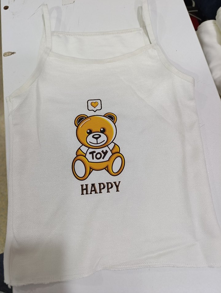 Önü renkli ayıcık ve "HAPPY" yazılı beyaz çocuk atlet, yumuşak kumaş ve kolsuz tasarım.