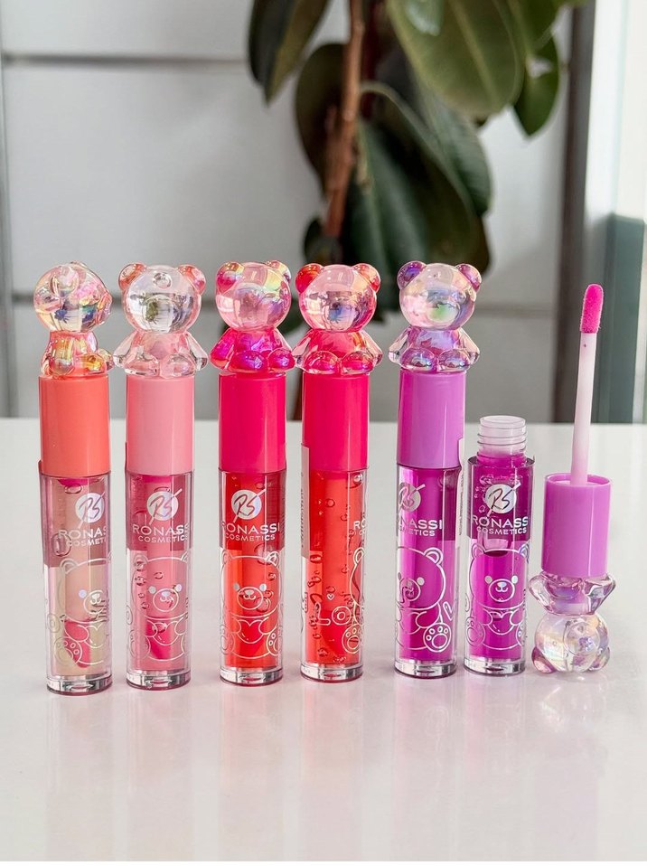 Renkli ve canlı pembe tonlarında, ayıcık şeklinde kapaklı parlak dudak parlatıcıları. Canlı bir parlaklık ve pürüzsüz sürüm sağlar.