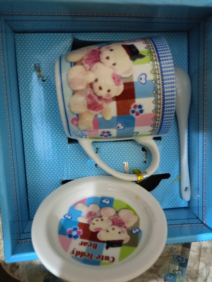 Mavi porselen kupa, renkli ayıcık desenleriyle birlikte gelir ve uyumlu bir tabağa sahiptir. İçim keyfi için şirin bir seçenek.