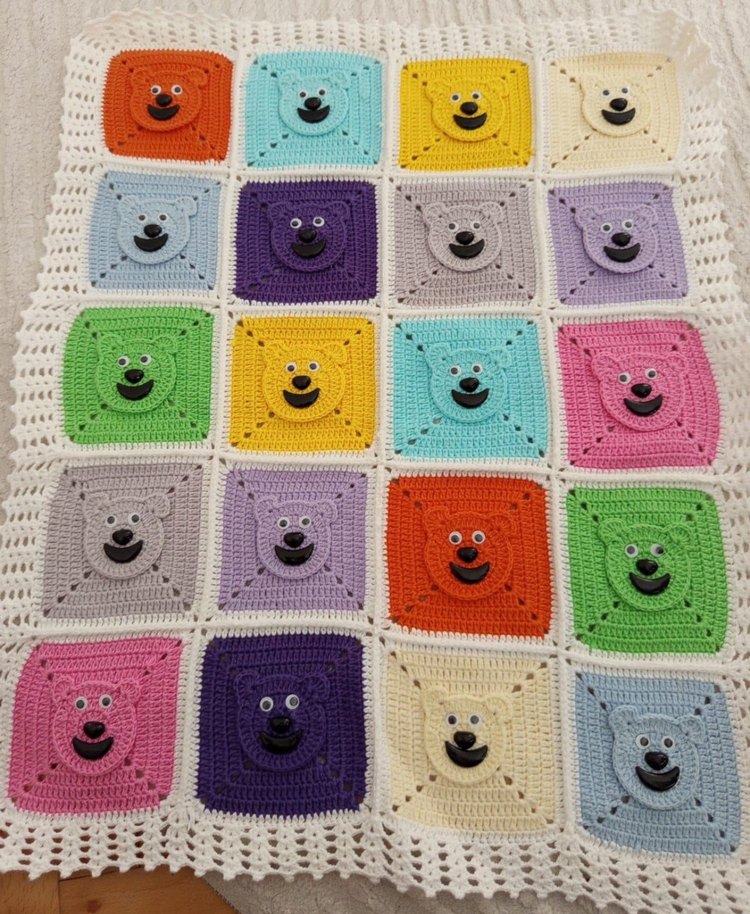 Renkli örgüden yapılmış, ayıcık desenli karelerden oluşan yumuşak ve sıcak çocuk battaniyesi. ÜRÜN TAMAMEN EL ÖRGÜSÜ OLDUGU IÇiN iSTENILEN ÖLÇÜ, RENK VE MODELDE YAPILABiLiR.