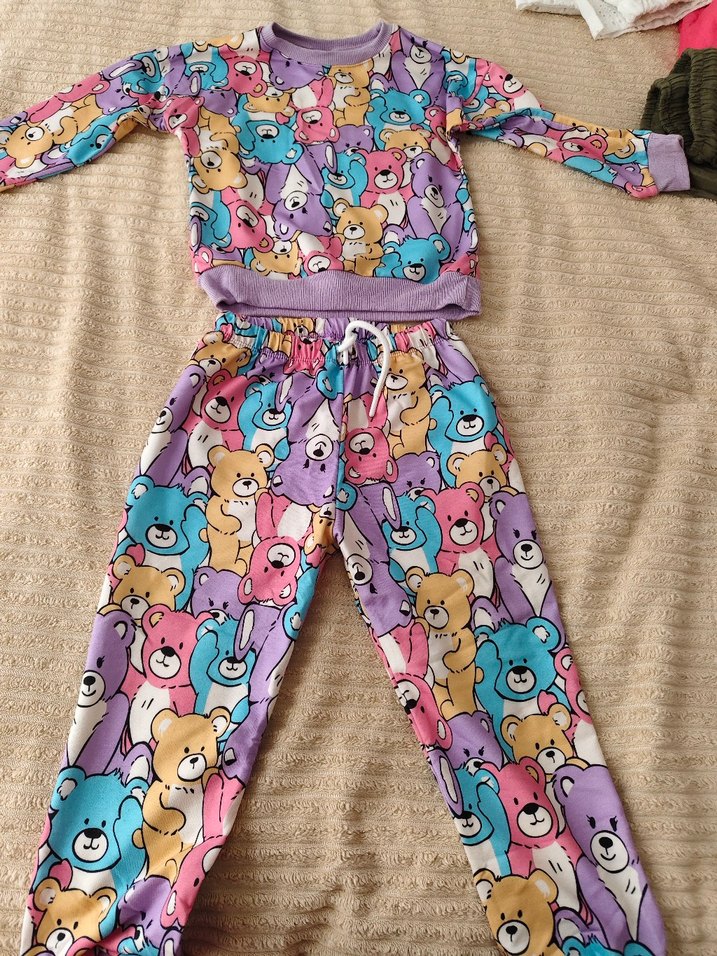 Uzun kollu, örme kumaştan yapılmış, pastel renklerde çok renkli ayıcık desenli bebek kız takımı. marka temsilidir.4 5 yaşa uygundur.Hediye geldiği için beden uymadı. 1 belki 2 defa giyildi.Kusursuzdur.