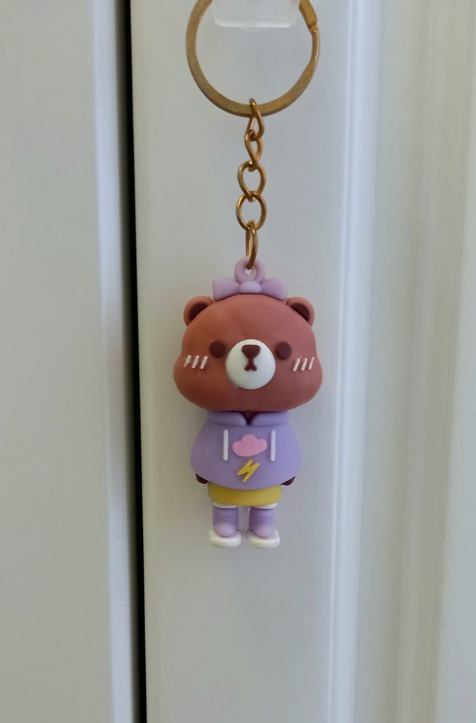Renkli ayıcık figürlü anahtarlık, mor kapüşonlu ve sarı etekli figürle zincir detaylıdır. Trendy günlük stile uygundur.