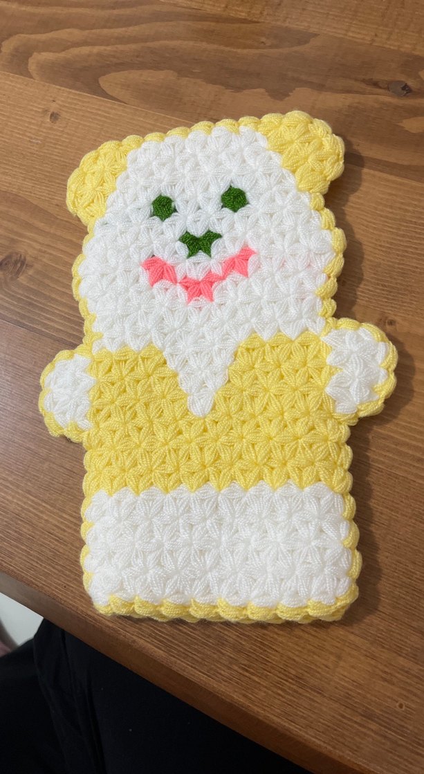 Sarı, beyaz, yeşil ve pembe renklerde yumuşak dokulu, ayıcık figürlü renkli banyo süngeri.