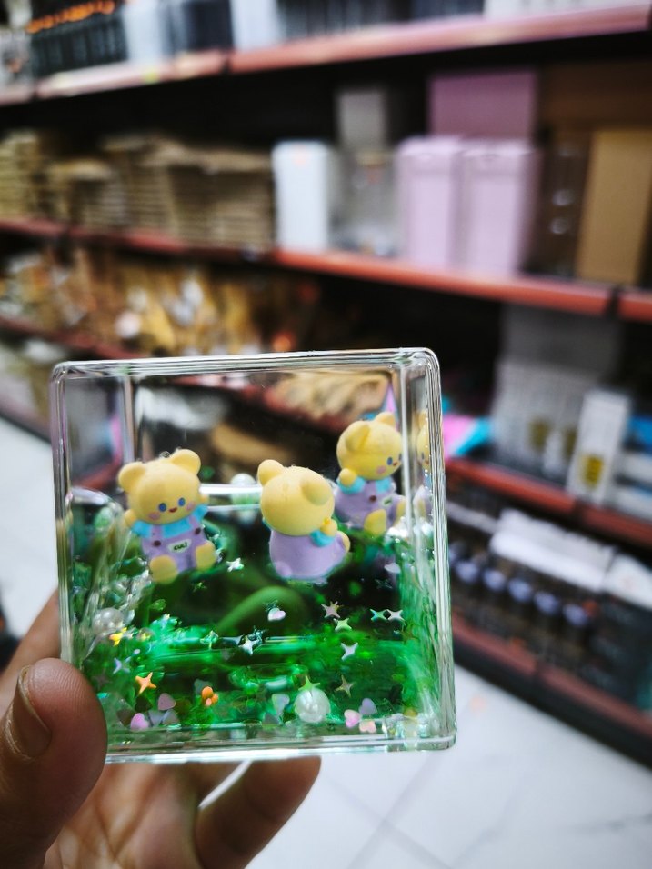 Canlı yeşil taban üzerinde üç küçük ayıcık figürlü renkli dekoratif küp, parıltılı detaylarla süslenmiştir. Görsel olarak hoş bir süs eşyasıdır.