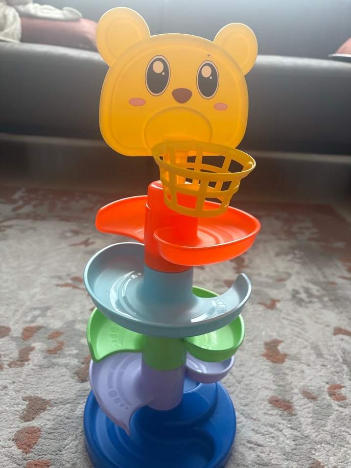 Renkli ayıcık figürlü, çoklu eğimli kaydıraklar ve küçük sepetiyle eğlenceli eğitim oyuncağı.