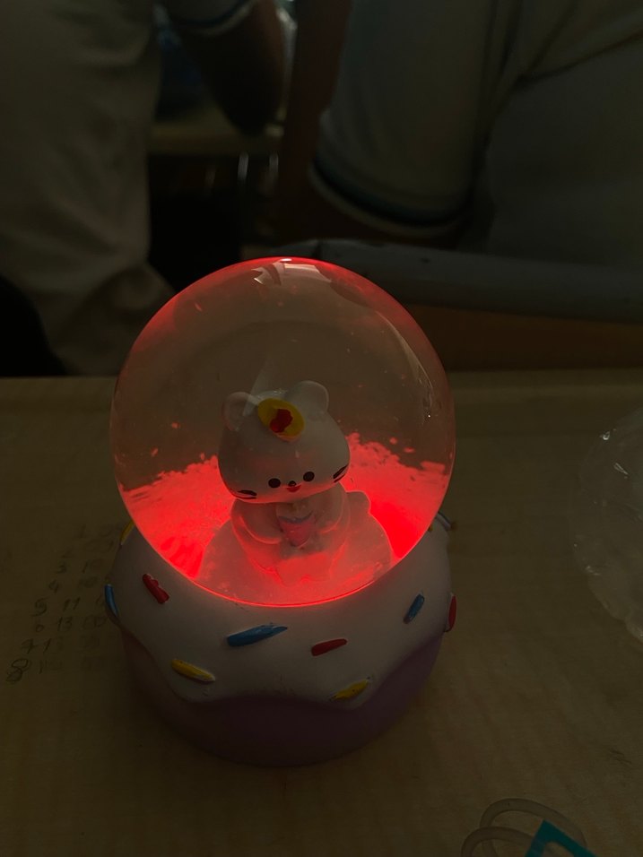 İçinde beyaz ayıcık figürü bulunan, kırmızı ışıkla aydınlatılan ve renkli şekerlemelerle süslenmiş tabana sahip renkli kar küresi. ❄️ IŞIKLIDIR