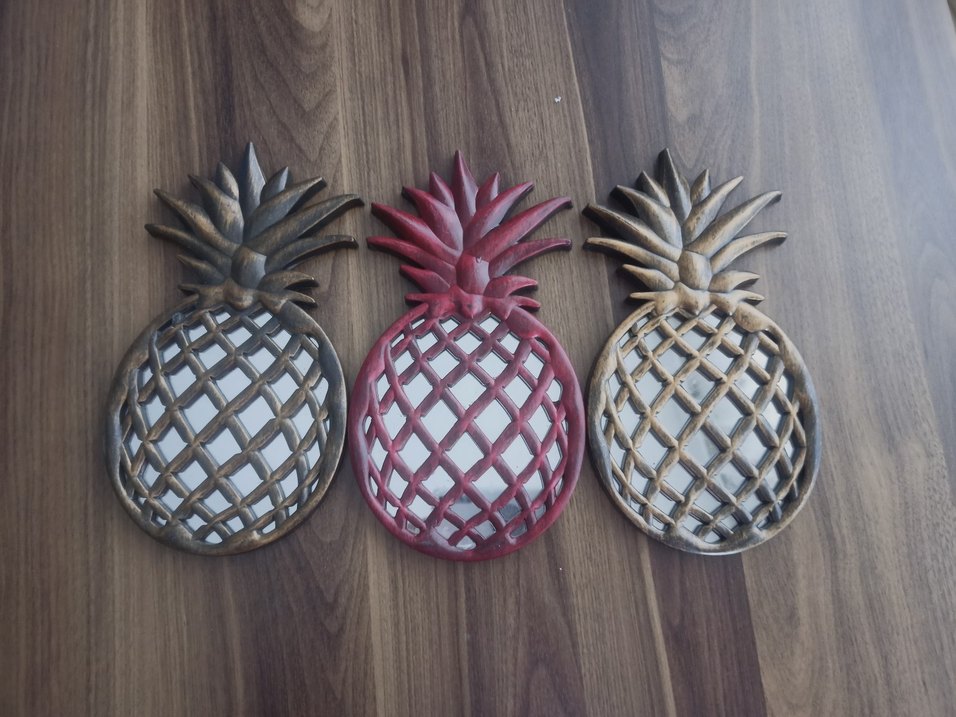 Koyu ve çok renkli, ananas şekilli aynalı dekoratif duvar süsleri. Sağlam malzemeden yapılmış, kafes desenli.
