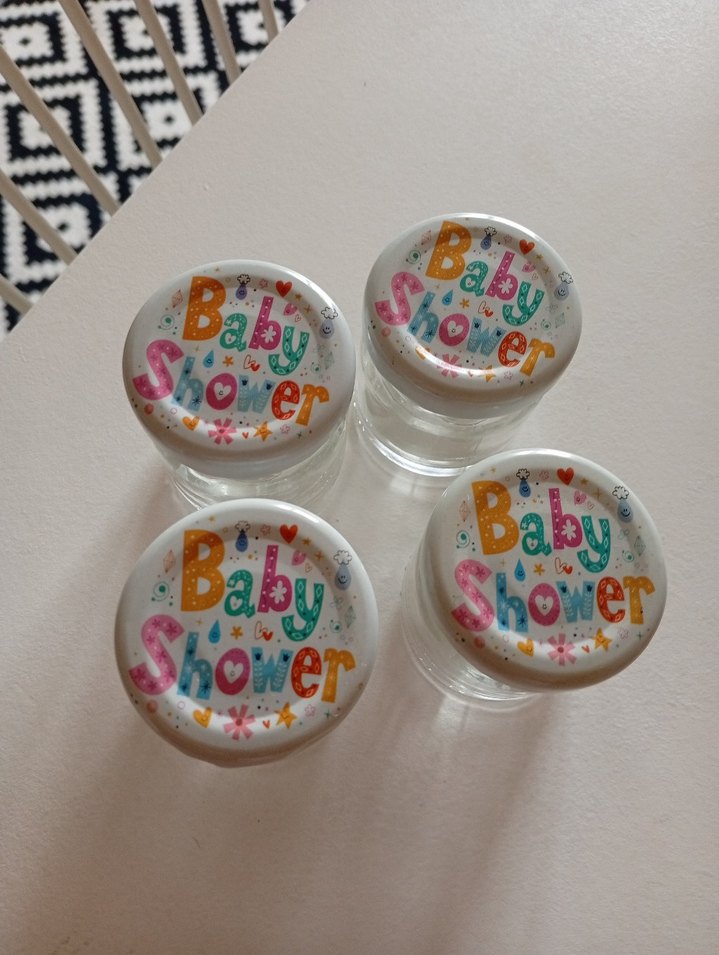 Üzerinde 'Baby Shower' yazısı ve renkli küçük figürler bulunan renkli bebek şişeleri. Bebek etkinlikleri için uygun. 4 adet bebek kavonoz