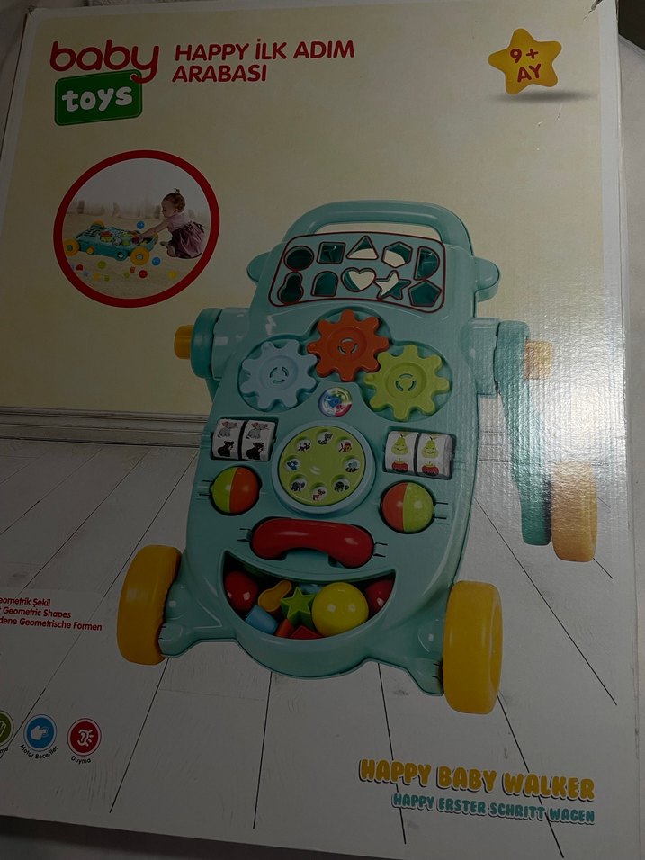 9+ ay bebekler için interaktif dişliler ve şekiller içeren renkli yürüyüş arabası. İlk adımlar için destek sağlar.önümdeki müzik aleti sesi cıkmıyo bazı şekilleri eksik o yüzden makul tutuldu