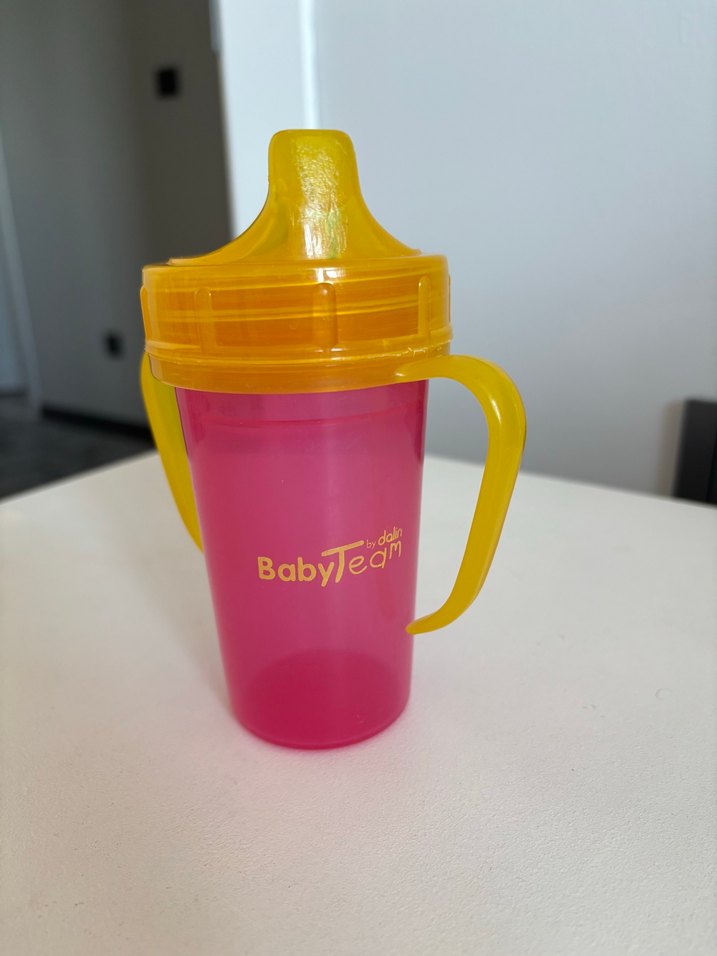 Renkli BabyTean bebek bardağı, pembe gövde ve sarı kulplar ile kolay tutuş ve içim sağlar. Az kullanılmış temiz hasarsız250-300 ml tahminen