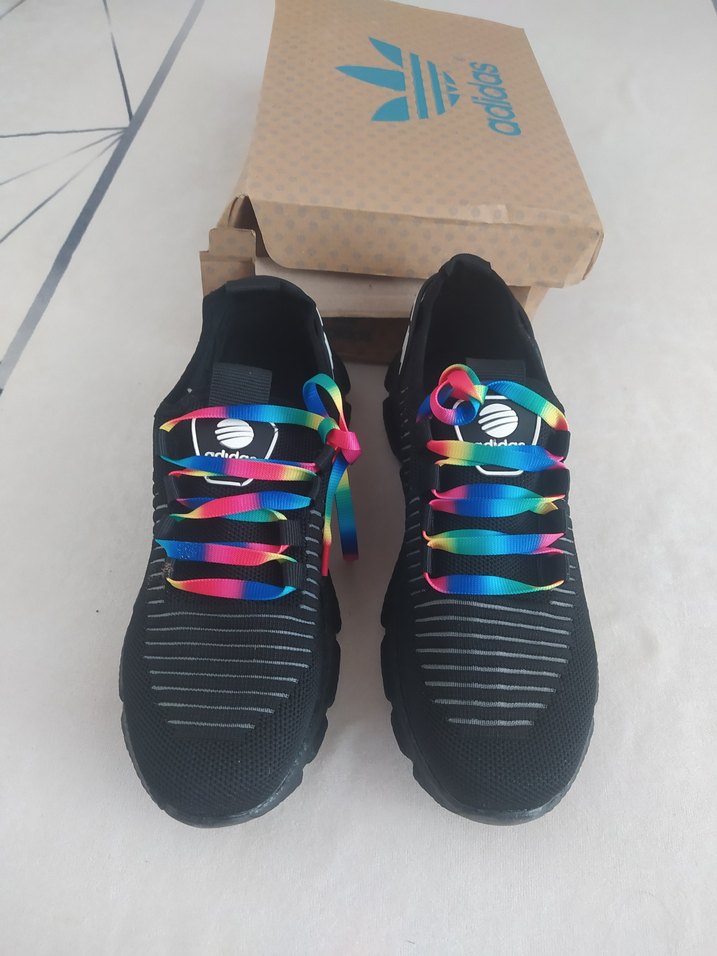 Nefes alabilen kumaştan siyah bayan spor ayakkabısı, çok renkli bağcıklarla ve rahat tabanıyla sokak stiline uygun. hmn kargo yapıyorum iade kabul etmiyorum sorarak alım yapın lütfen