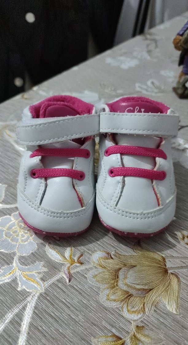 Renkli pembe bağcıkları ve cırt cırtlı beyaz ilk adım ayakkabısı, kauçuk malzemeden üretilmiştir.