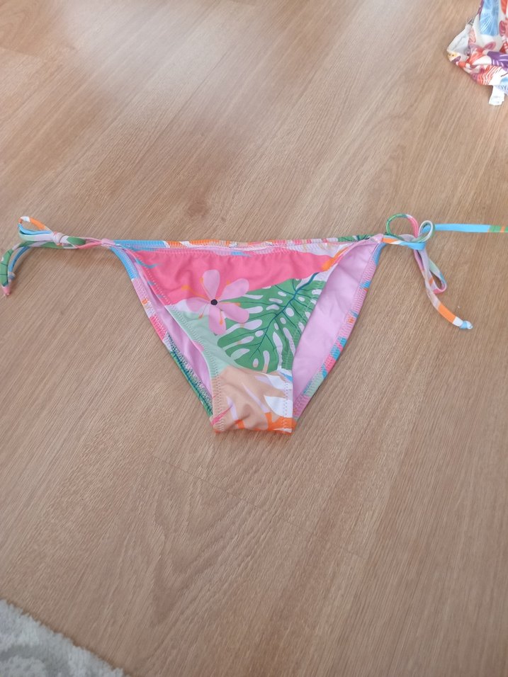 Renkli bağcıklı bikini altı, çiçek ve yaprak desenleriyle bohem tarzda. Elastik ve vücuda oturan yapısı, plaj için uygundur.