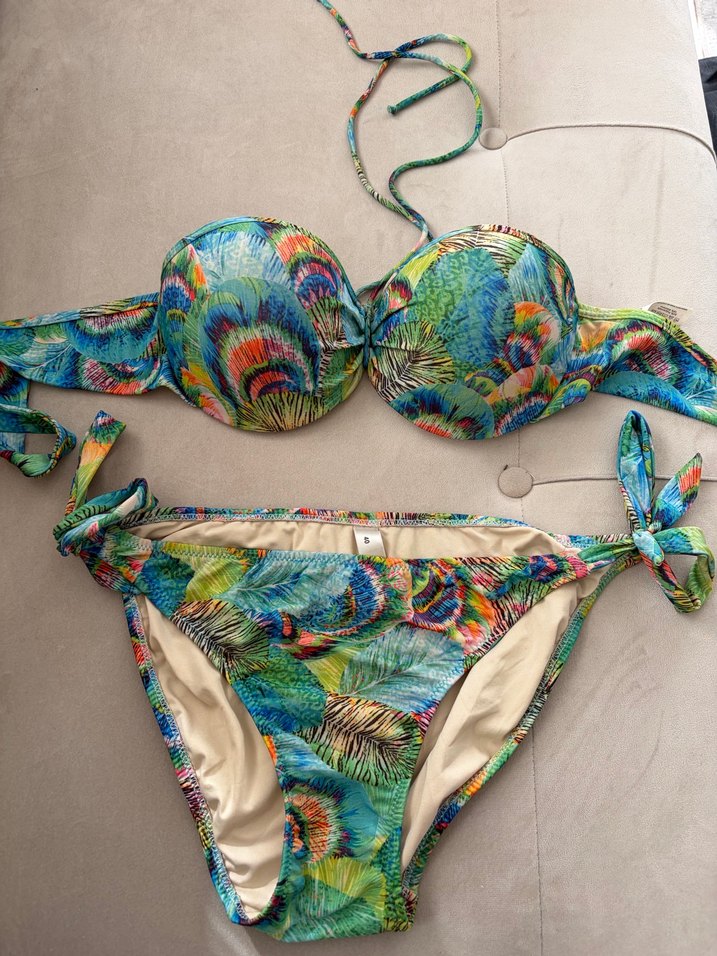 Renkli bağcıklı ve tokalı detaylara sahip, bağlamalı askılı, bohem tarzda sıkı oturan bikini takımı.