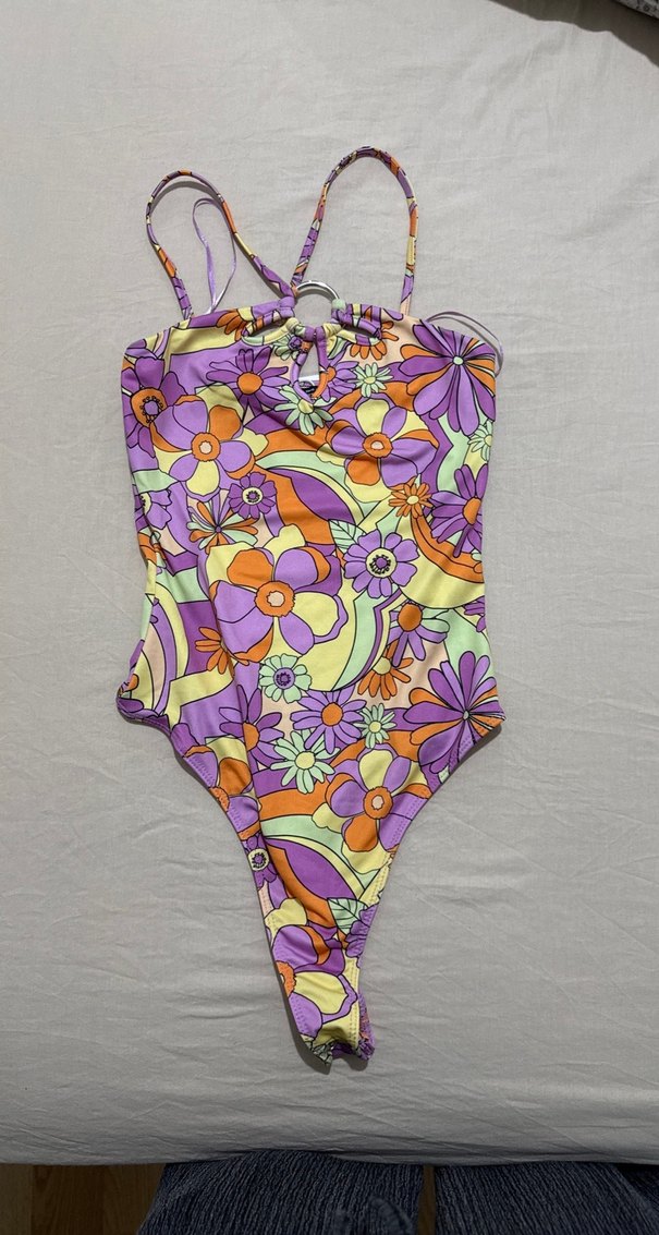 Renkli bağcıklı askıları ve dantel detaylarıyla, bohem retro tarzını yansıtan çiçek desenli, vücuda oturan kadın mayo.