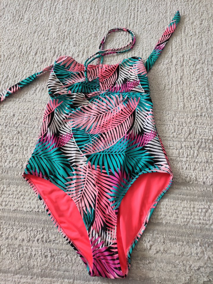 Renkli yaprak desenli, bağcıklı ve fermuarlı, midi uzunlukta kadın mayo. Canlı ve bohem tarzıyla plajda dikkat çeker.