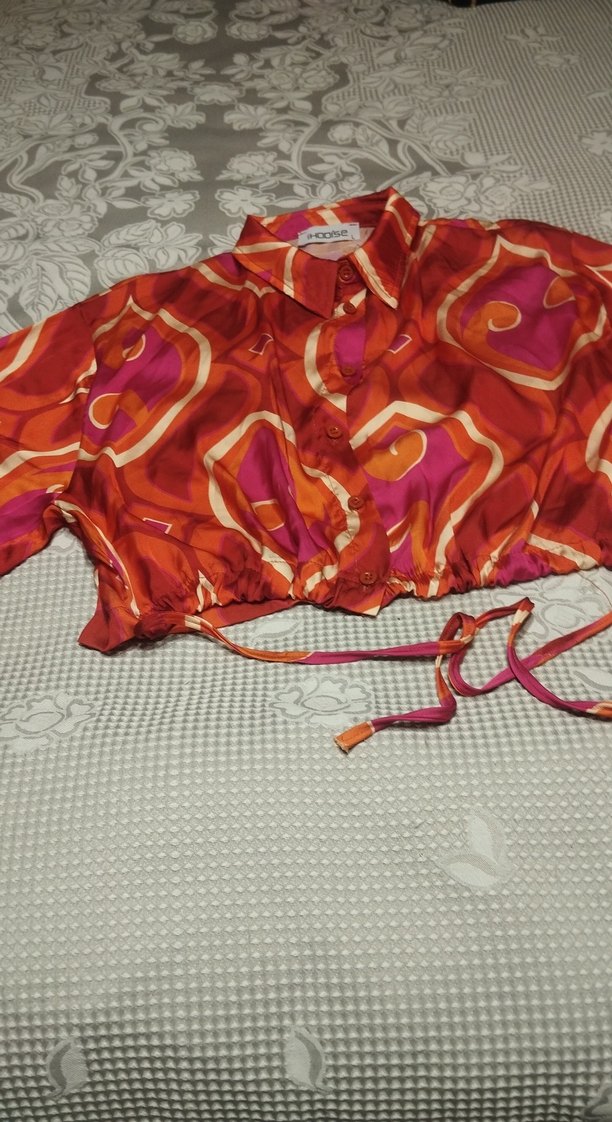 Renkli batik desenli gömlek, tekne yaka, düğmeli ve askılı kollu. Bol kesim, kısa boy ve belde ayarlanabilir bağcıklı. İpeksi kumaştan, bohem tarzda.